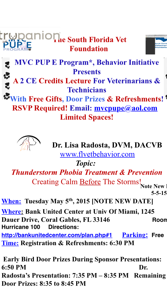 Creating calm before the storms : thunderstorm phobia prevention and treatment Posted bymiaminaturalpet May 6, 2015 Leave a comment on Creating calm before the storms : thunderstorm phobia prevention and treatment Miami Natural Pet Care is attending dr. Radosta meeting tonight Share this: Click to email a link to a friend (Opens in new window) Email Click to share on X (Opens in new window) X Click to share on Facebook (Opens in new window) Facebook Click to share on Pinterest (Opens in new window) Pinterest Like Loading...