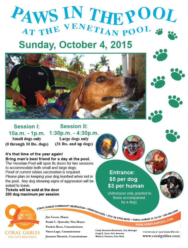 The Venetian Pool will open its doors on Sunday, October 4, 2015 for two sessions to accommodate both small and large dogs. Please bring proof of current rabies vaccination and be prepared to clean up life’s little messes. Only those accompanied by a dog will be permitted to enter the facility. Please plan on keeping your dog leashed when not in the pool. Any dog showing signs of aggression will be asked to leave.