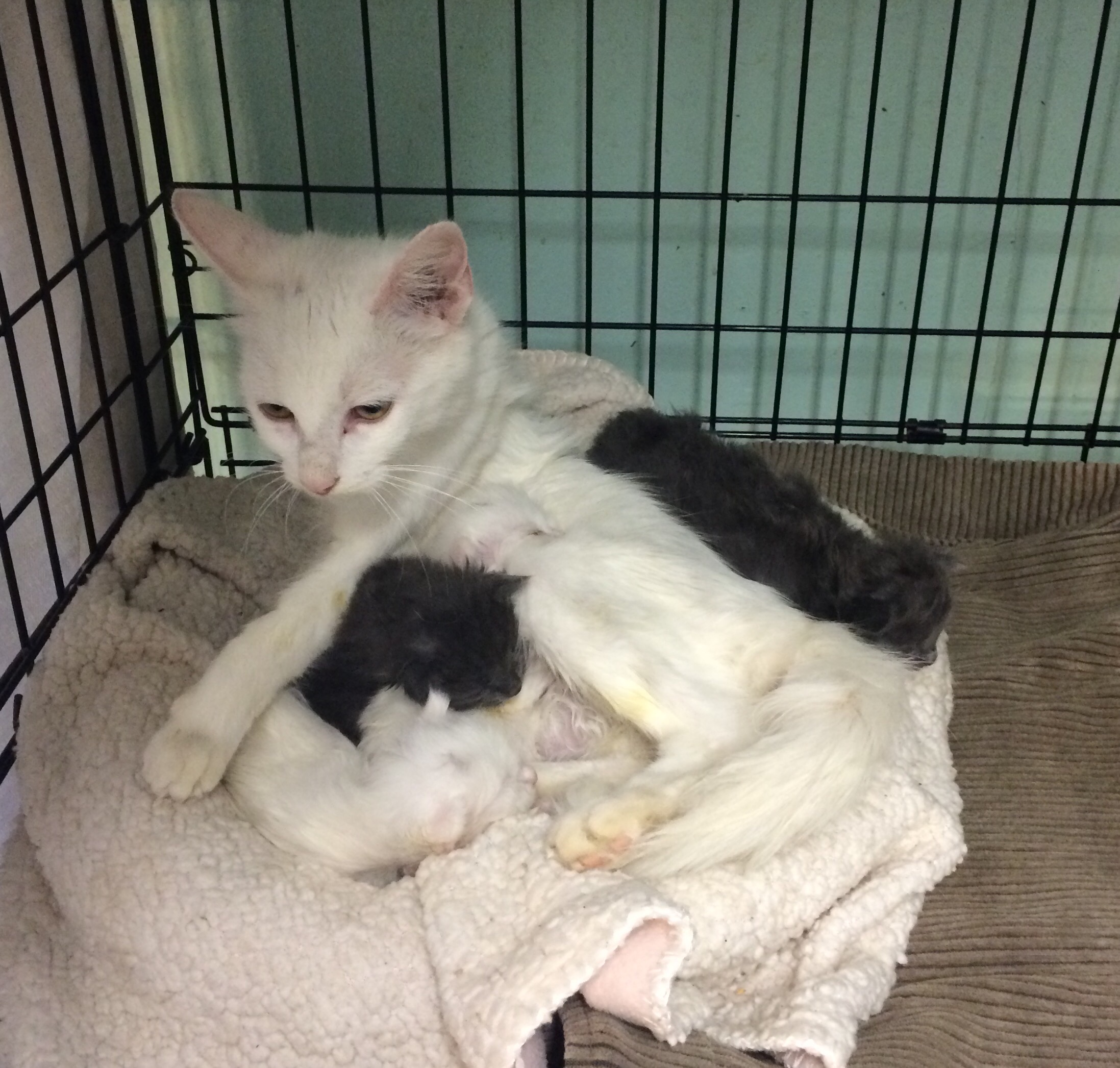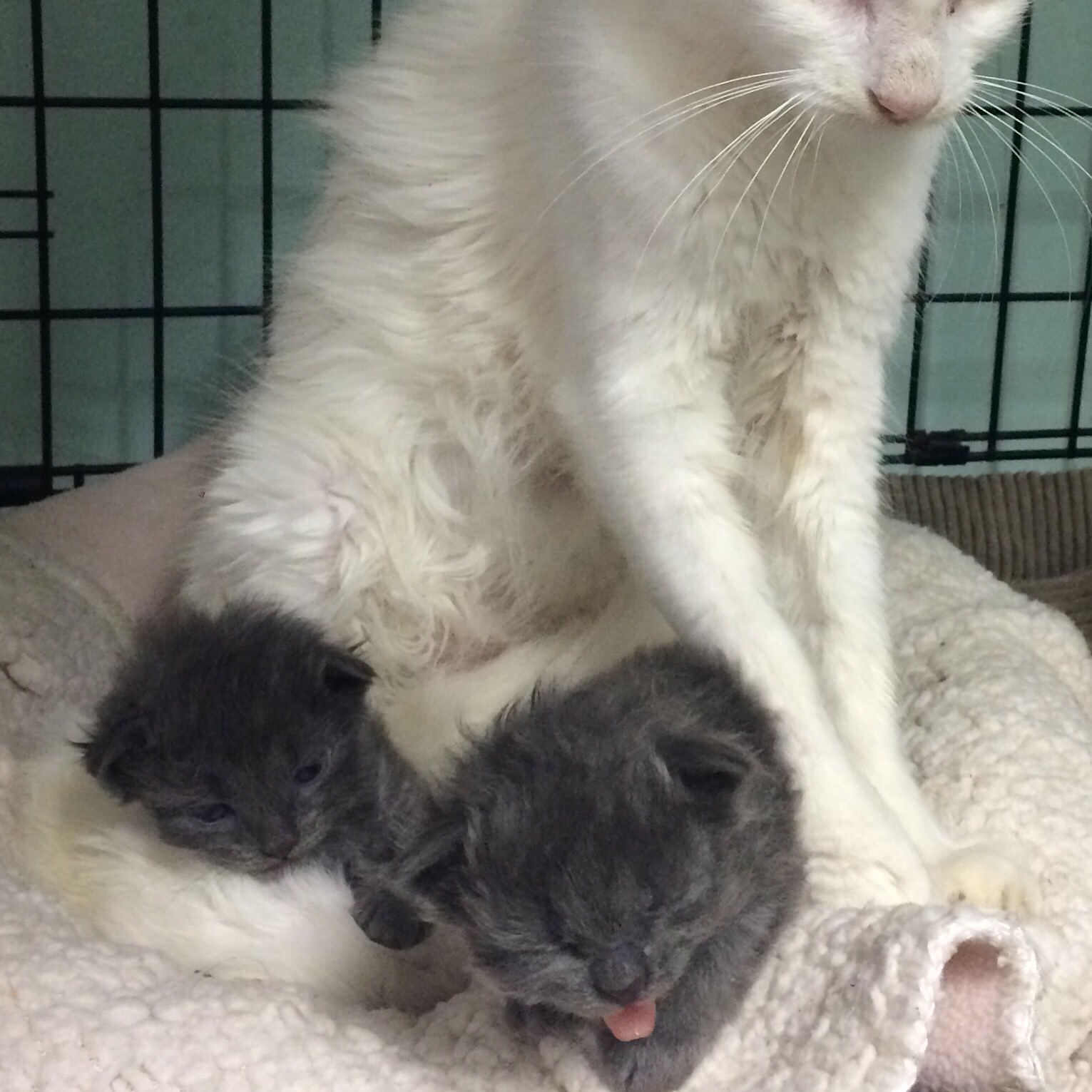 Beautiful fluffy white mommy for adoption with her 4 babies, 2 grey and 2 long hair white ones. No commonly seen! And the mom is so sweet and friendly. Please anybody interested contact Miami Natural Pet Care or Jollymutt, grooming saloon.