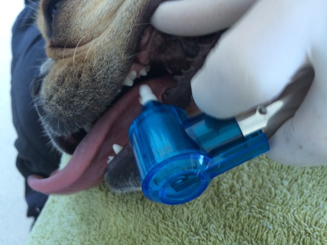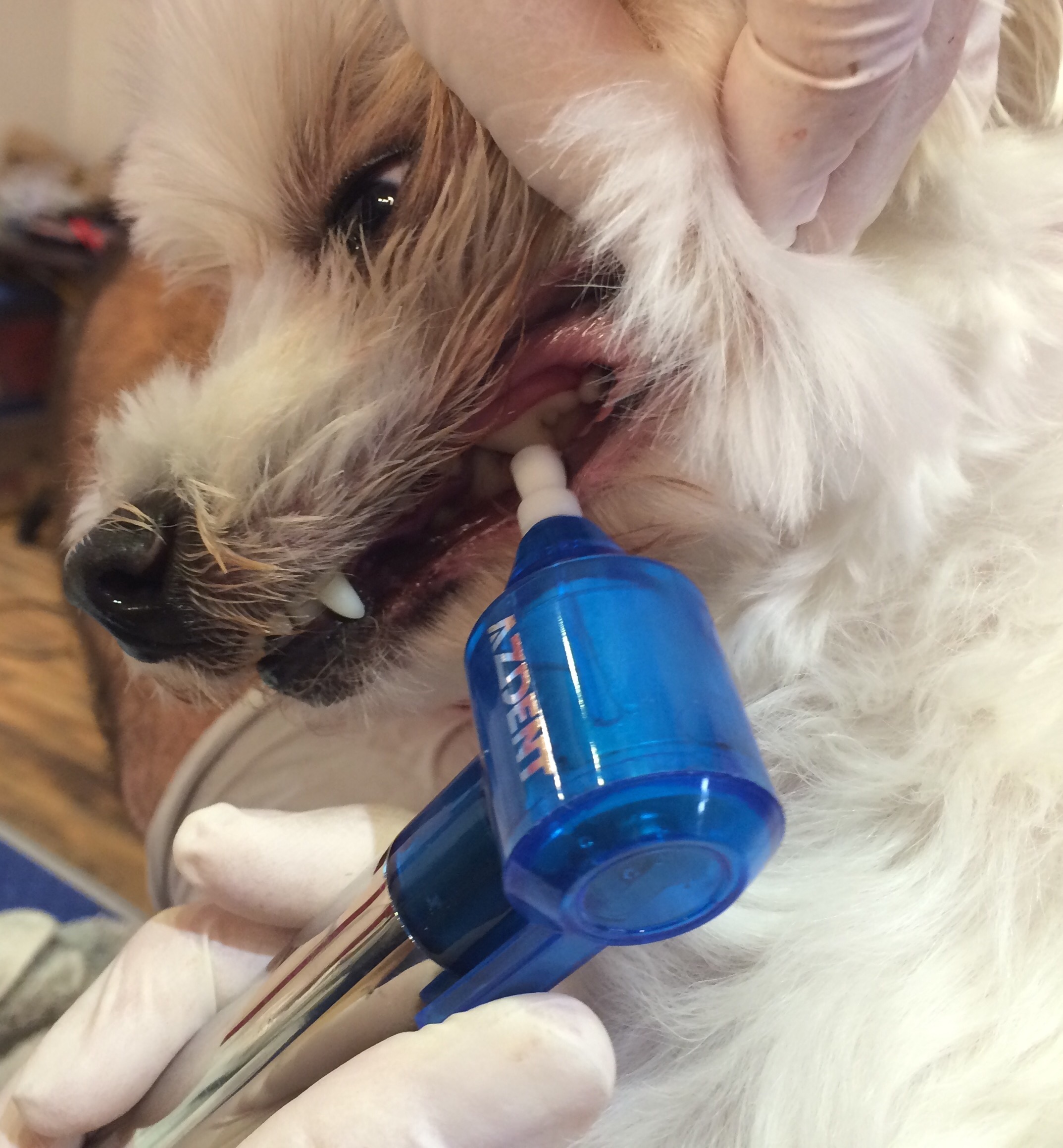 After the teeth are scaled and probed we spray them with chlorhexidine to further help eliminate the bacteria that are causing gingivitis.
